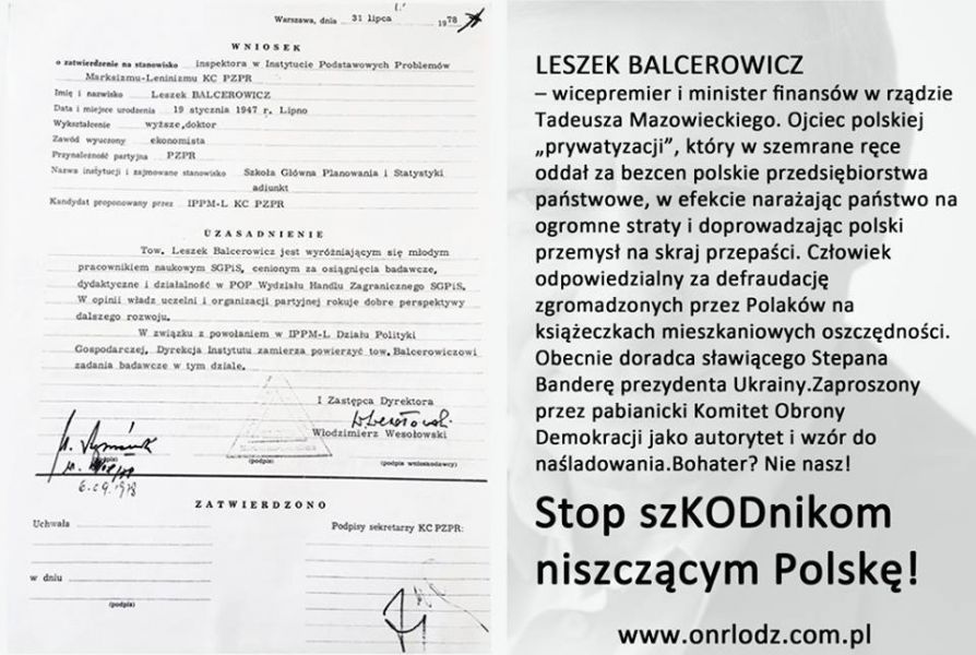 Poseł na Sejm III kadencji (w latach 1997–2000) w jednym z ostatnich wywiadów wyraził swoje zaniepokojenie rozszerzaniem władzy przez jedną partię oraz nawoływał do przeciwstawienia się takiej sytuacji. Być może stąd zaczerpnięto inspirację na hasło przewodnie niedzielnego wykładu. Nie byłoby jednak w tym nic dziwnego, gdyby nie zaangażowanie pana Balcerowicza we współtworzeniu systemu komunistycznego w czasach PRL. Ówczesne rządy praktycznie jednej opcji politycznej (Polskiej Zjednoczonej Partii Robotniczej), której sam był członkiem, nie budziły aż tak dużego niepokoju jak teraźniejsze rządy demokratycznie wybranej partii. W tamtych czasach znanemu reformatorowi gospodarczemu władza w rękach komunistów nie przeszkadzała, ponieważ w ich oczach „dobrze rokował” i wyróżniał się swoją pracowitością. W ramach akcji informacyjnej pabianicki oddział Obozu Narodowo – Radykalnego w dniu spotkania rozdawał ulotki zawierające krótką notkę na temat tow. Leszka Balcerowicza oraz ksero wniosku o zatwierdzenie jego na stanowisko inspektora w Instytucie Podstawowych Problemów Marksizmu – Leninizmu KC PZPR z dnia 31 lipca 1978 roku. Jak można było się spodziewać, mimo sporego zainteresowania spotkaniem organizowanym przez Komitet Obrony Demokracji, młodych słuchaczy praktycznie na nim nie było.