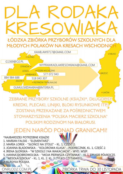 Młode pokolenie Kresowiaków nie ma łatwo: zamykane są polskie szkoły, ograniczany dostęp do polskiej kultury, a nierzadko również - ubóstwo. Dlatego rozpoczynamy zbiórkę przyborów szkolnych: zeszytów, długopisów, kredek, plecaków, linijek itd. Przyjmujemy również książki polskich autorów, szczególnie pozycje edukacyjne. Lista najpotrzebniejszych lektur do kształcenia młodych Polaków: