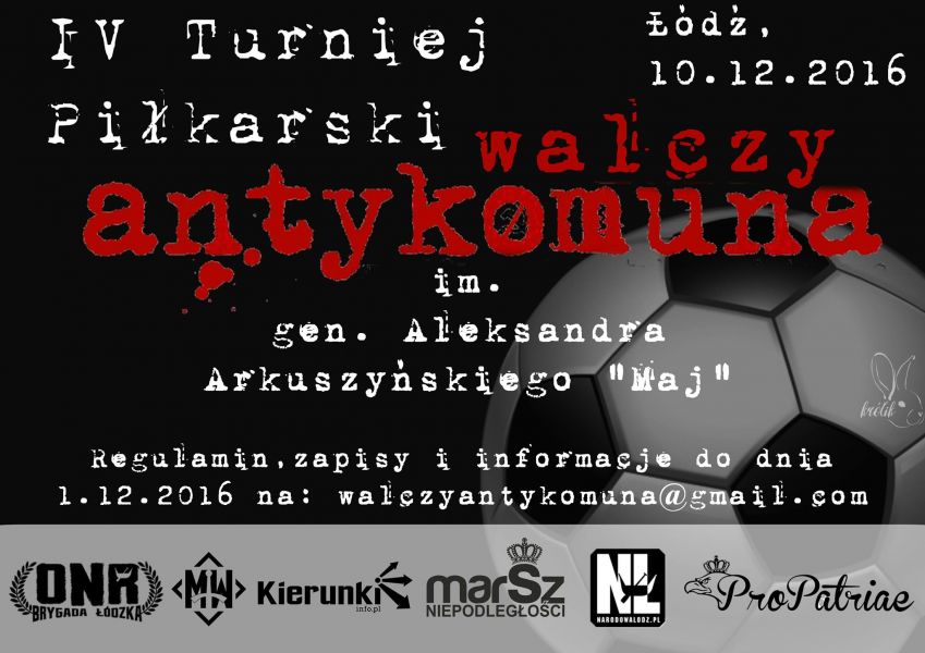 ONR Brygada Łódzka zaprasza na IV edycję turnieju piłkarskiego Walczy Antykomuna. Drużyny będą walczyć o puchar gen. Aleksandra Arkuszyńskiego ps. ''Maj'' - generała brygady Wojska Polskiego, kawalera orderu Virtuti Militari, odznaczonego dwukrotnie Krzyżem Walecznych.