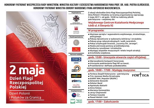 Zapraszamy na rodzinny piknik patriotyczno-wojskowy z okazji Dnia Flagi, który odbędzie się 2 maja w godzinach 10.00 - 17.00 w Wojskowym Centrum Kształcenia Medycznego na ul. 6 Sierpnia 92 w Łodzi.