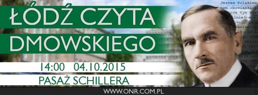 Serdecznie zapraszamy wszystkich mieszkańców Łodzi na niecodzienne wydarzenie. 4. października o godzinie 14:00 na Pasażu Schillera zostaną odczytane niezwykle aktualne dzisiaj myśli architekta niepodległej Polski - Romana Dmowskiego.
