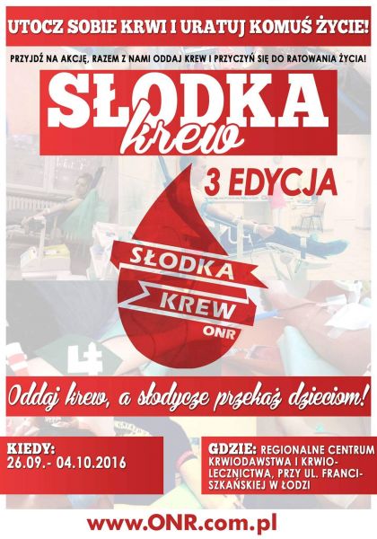 Mamy przyjemność po raz trzeci zaprosić Was na ogólnopolską akcję charytatywną "Słodka Krew", organizowaną przez działaczy Obozu Narodowo-Radykalnego Brygady Łódzkiej. Chcemy zachęcić do honorowego oddawania krwi, jako jednej z najprostszych form patriotyzmu.